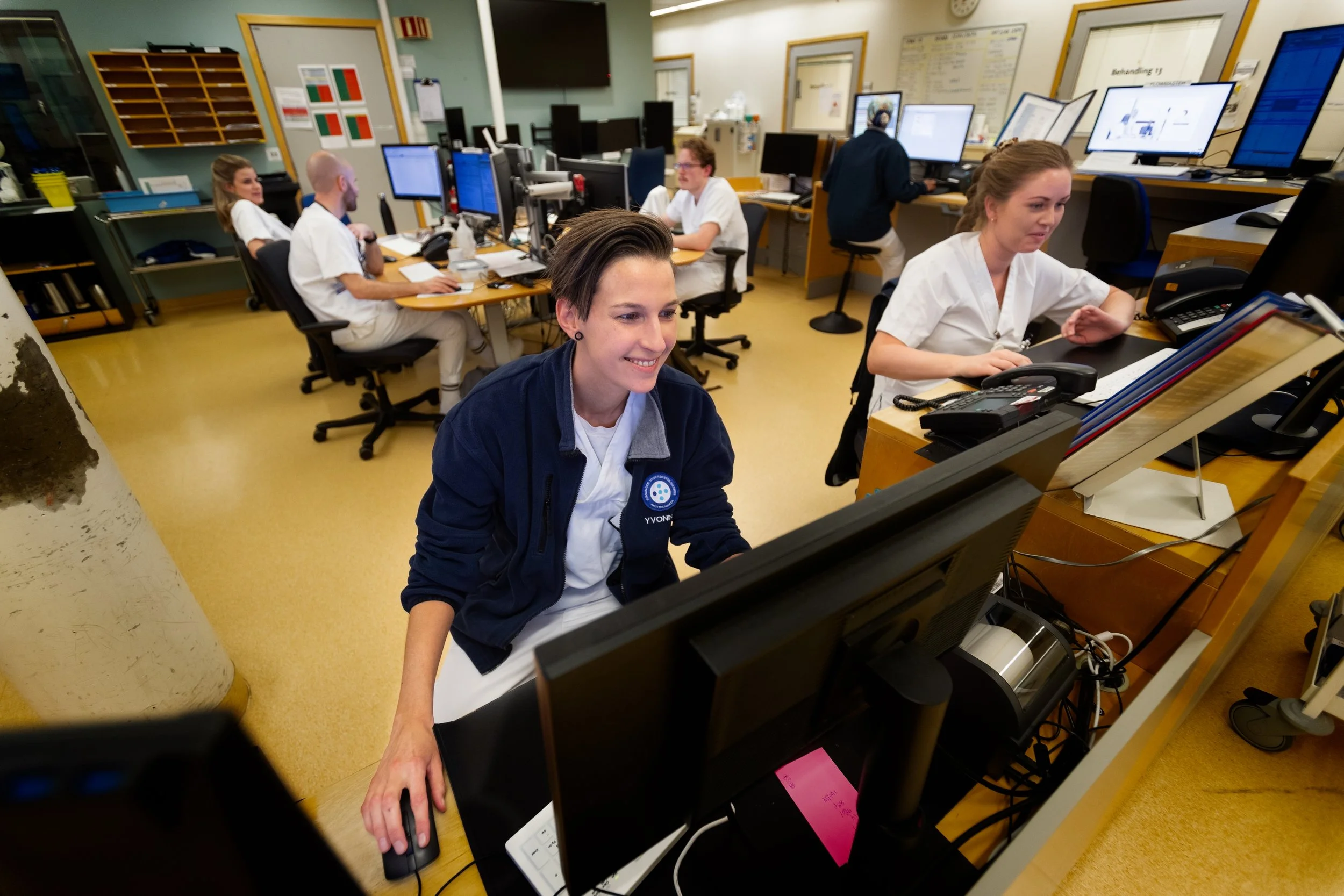 - På den positive siden er det bedre med natt i mottak enn på sengepost. For her går det i ett hele tiden, det er ikke en «sove-stemning» her. Du jobber jevnt, men så du står i høyt press og stress gjennom store deler av vakten og ofte hele vakten. Jeg inhalere maten og utsetter tissepausen til det ikke går lenger, sier Yvonne Janson, som har jobbet heltid i en 3-delt turnus i 8 år.